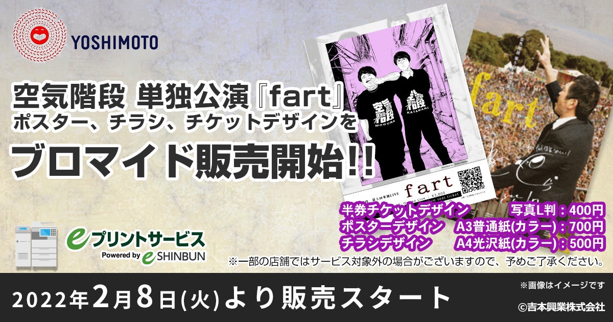 また、全国のコンビニのマルチコピー機でプリントできる「eプリントサービス」で、単独公演「fart」オリジナルデザインのブロマイドを販売開始します。サイン入りのキービジュアル(A3、A4)の他、3月31日(木)の千秋楽公演で行われる配信の“半券チケット風”ブロマイドも!会場や配信でLIVEを観た記念に是非お買い求めください。