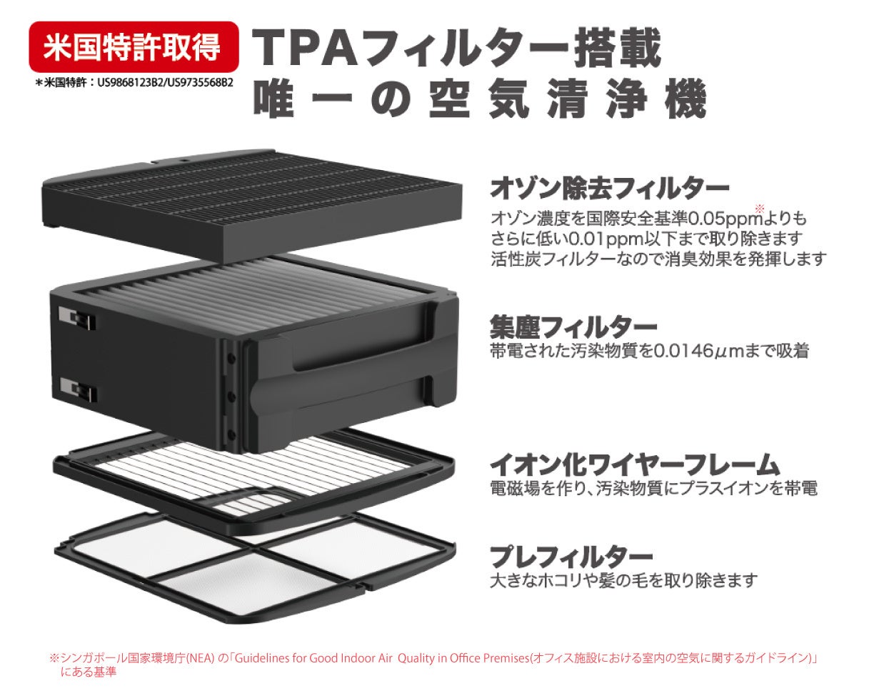 メーカー独自の電気集塵技術を用いたTPAフィルター(米国特許取得)を搭載した空気清浄機です。4層で構成されたフィルターによって微細な粒子まで捕集が可能となりました。
