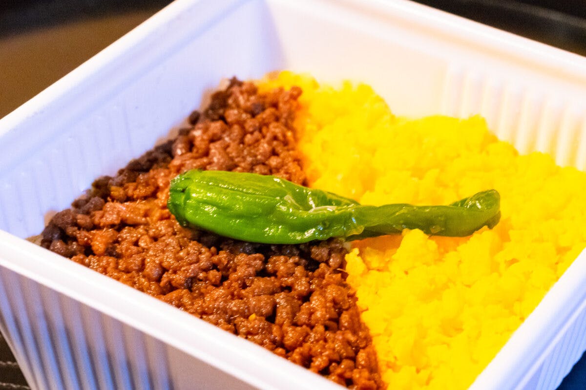 2段目は、そぼろ丼。「そぼろ」と「たまご」の2色に、「シシトウ」の緑色が色彩のアクセントとなっていてキレイですね。