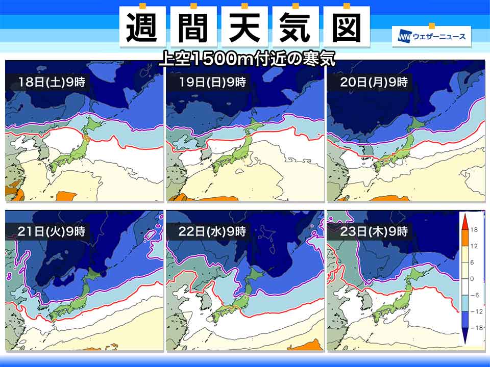20日(月)頃からは冬の空気が南下し、21日(火)は-6℃ラインが本州の南、-12℃を示す紫色のラインが東北付近にかかる予想となっています。日本海側は雪となり、寒くなる見込みです。