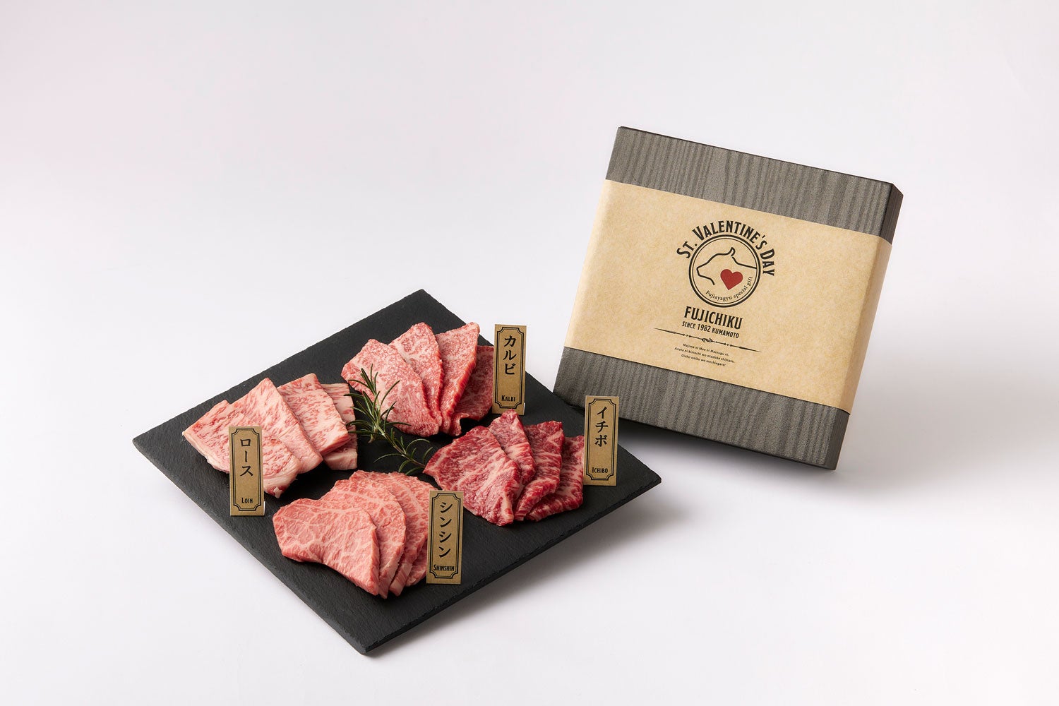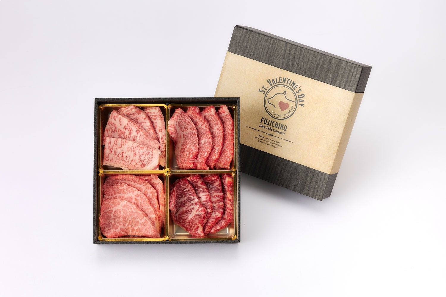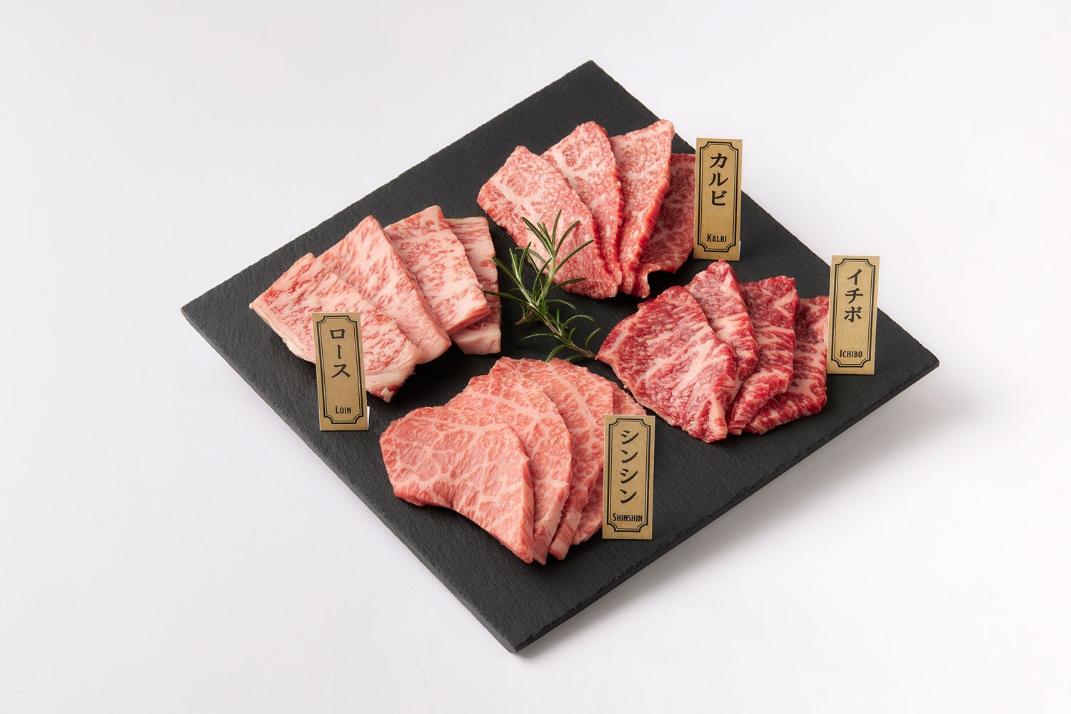 カルビ、モモ、イチボ、シンシンの4種類が入った1つで多彩なお肉の部位が楽しめるギフトです。また、既存のギフトボックスではなく外装も新たにより高級感を持たせた商品です。