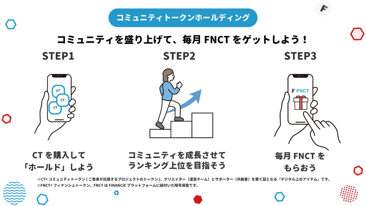 FiNANCiEではこのトークンを「CT(コミュニティトークン)」と呼んでいます。ユーザーは応援したいプロジェクトのCTを持ち続ける(保有する)と、様々な“限定特典“が受けられるようになり、さらに「ホールド(CTH)」して応援を継続することで、株式会社フィナンシェが発行する暗号資産“FNCT”が毎月もらえるチャンスも生まれます。