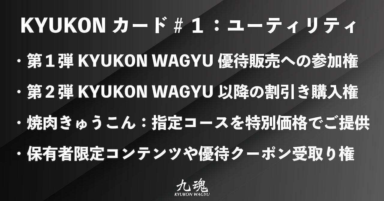 今回のファンディングの支援特典として、約20ヶ月の肥育が終了したのちに実施される「第1弾KYUKON WAGYU優待販売」への参加条件となるメンバーシップNFT「KYUKONカード#1」の追加発行が決定いたしました。