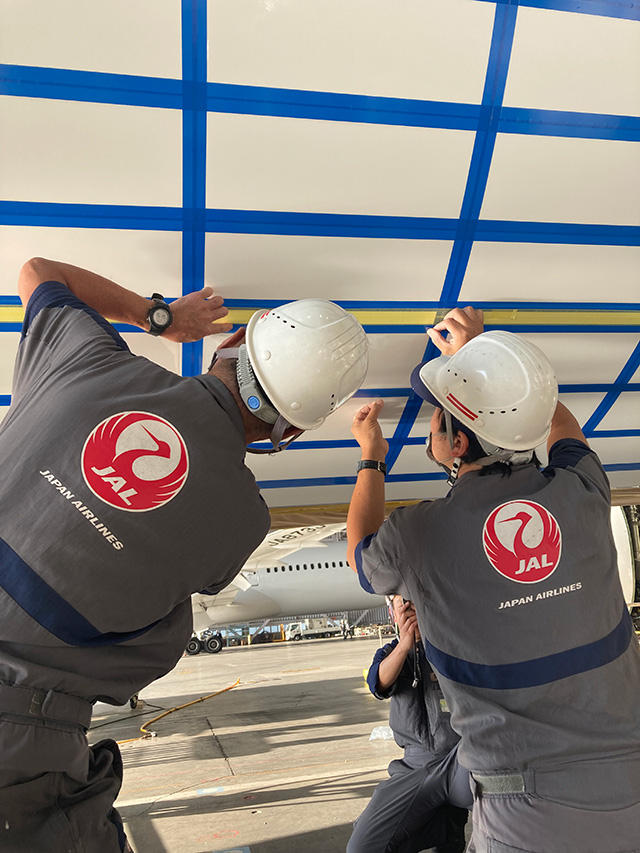 737-800の機体下部にリブレット施工するJALグループのスタッフ(同社提供)